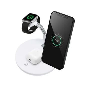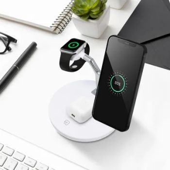Ładuj więcej urządzeń za pomocą jednego akcesorium! Ładowarka pozwala na jednoczesne ładowanie indukcyjne kilku typów urządzeń: telefonów komórkowych, zestawów TWS (w tym Airpods) oraz zegarków iWatch. Kompatybilna z serią iPhone 12.