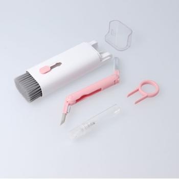 Zestaw 7 w 1 – narzędzie do czyszczenia, w zestawie z rysikiem do czyszczenia słuchawek z silikonowym klipsem, plastikowym klipsem, gąbką i szczotką, sprejem z roztworem do czyszczenia ekranu i wysuwaną szczoteczką do klawiatury o wysokiej gęstości ze ściereczką z ultramikrofibry, breloczkiem do kluczy i miękką pluszową ściereczką do czyszczenia okularów.
