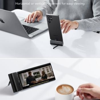 Składany stojak podtrzymuje smartfon w pionie i poziomie pod kątem odchylenia 68 stopni pozwalając na korzystanie ze smartfona podczas ładowania.