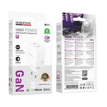 Ładowarka sieciowa 2x Typ C Borofone BN31 Cargador GaN QC 3.0 PD 45W z kablem Typ C na Typ C Biały